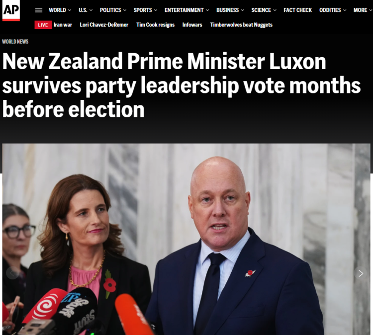 新西兰总理拉克森4月21日表示,在近期民调支持率暴跌引发外界猜测其可能遭罢免后,他已在所属的国家党议员的信任投票中成功过关,将继续担任总理一职。