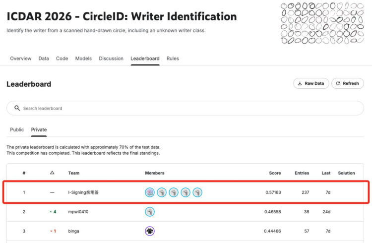 日前,在ICDAR 2026-CircleID:Writer Identification(圆圈书写者身份识别)全球挑战赛中,来自重庆两江新区的企业重庆亲笔签数字科技有限公司(以下简称“亲笔签”)的算法专家覃勋辉率领团队,力压全球113支参赛队伍,以超第二名10.6个百分点的绝对优势斩获世界第一。