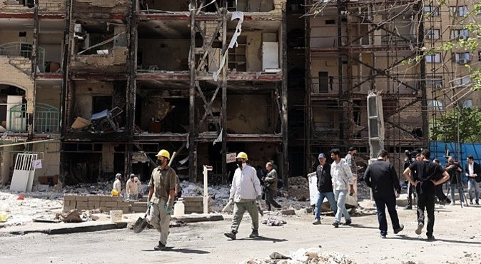 4月14日,工人在德黑兰一处住宅区清理瓦砾。(IC photo)