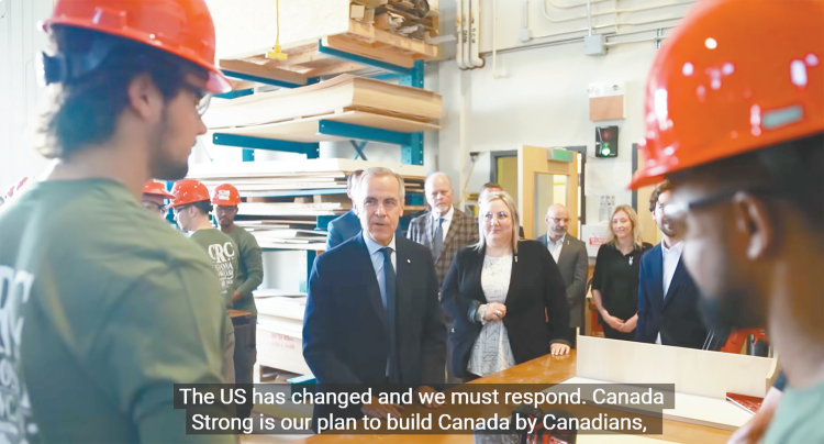 加总理卡尼19日发表视频讲话时表示,“美国已发生变化,我们必须作出回应”。图为该视频里出现的卡尼视察加拿大工厂的画面。(卡尼社交媒体账号)