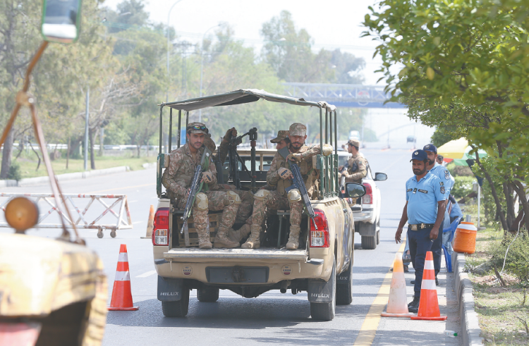 21日,巴基斯坦军警在伊斯兰堡加强安保措施。(视觉中国)
