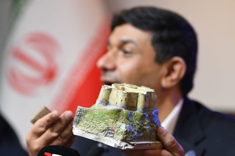 2026年3月31日,在伊朗首都德黑兰,伊朗联合国教科文组织全国委员会秘书长哈桑·法尔图西手持法拉克·奥尔·阿夫拉克城堡的模型出席新闻发布会。新华社记者沙达提摄