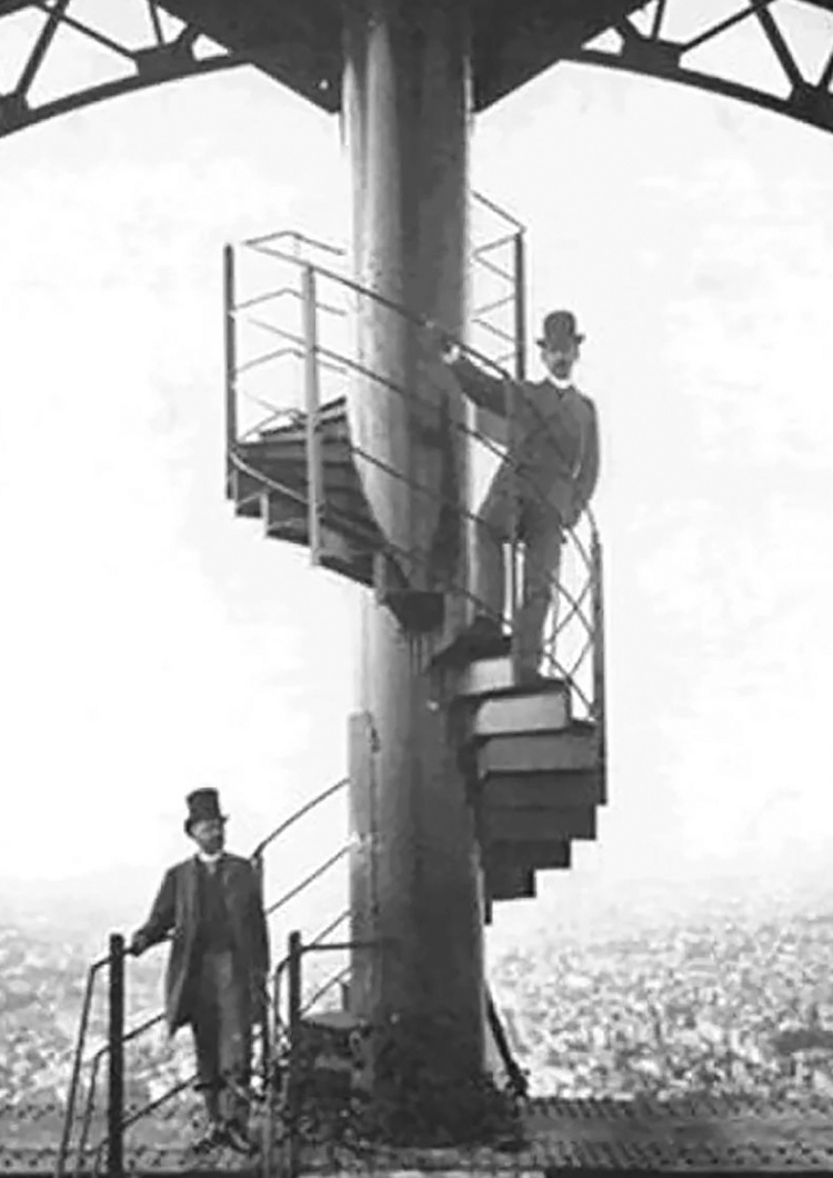 埃菲尔铁塔设计者埃菲尔(左)在楼梯上,图片摄于1889年。