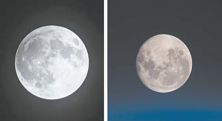 北半球看到的满月(左),其月面特征与南半球看到的满月(右)恰好调转了180度。